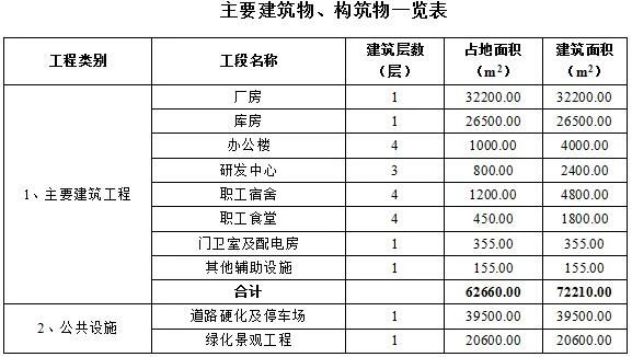 本次建設(shè)項(xiàng)目總用地面積350畝,總建筑面積為72210.00平方米,主要建筑內(nèi)容及規(guī)模如下表: