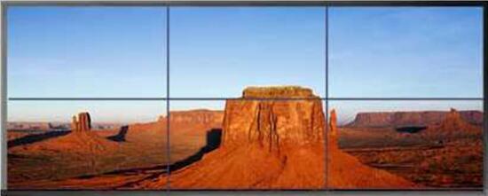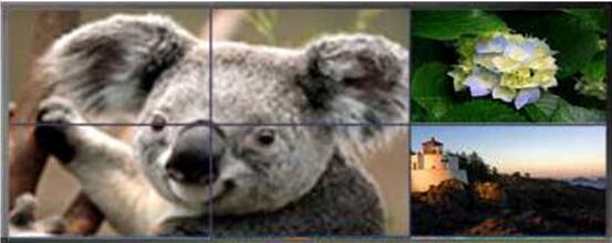 如上圖,每個(gè)液晶單元可以單獨(dú)顯示一路電腦畫面或監(jiān)控錄像等圖像格式,每個(gè)單元顯示的信號(hào)可任意切換。組合拼接顯示: