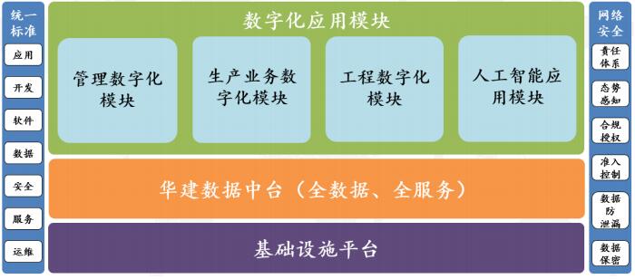 項(xiàng)目建設(shè)內(nèi)容 本項(xiàng)目的建設(shè)內(nèi)容包括基礎(chǔ)設(shè)施底層平臺(tái)、智能化數(shù)據(jù)中臺(tái)以及管理數(shù)字化、 生產(chǎn)業(yè)務(wù)數(shù)字化、工程數(shù)字化、人工智能應(yīng)用四大應(yīng)用模塊,具體建設(shè)架構(gòu)如下 圖所示: