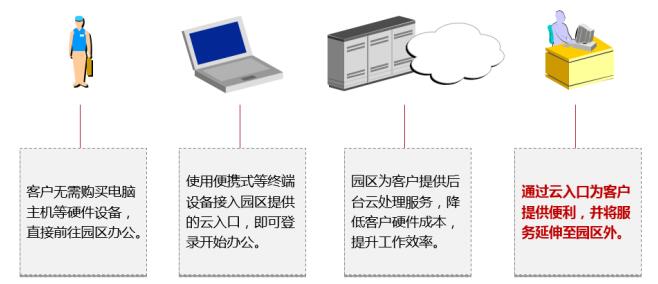 企業(yè)客戶可以通過云端入口,直接憑借賬號登陸并進(jìn)行日常辦公,云計算服務(wù)將突破園區(qū)內(nèi)外界限,提升企業(yè)靈活度,將服務(wù)延伸至園區(qū)外。