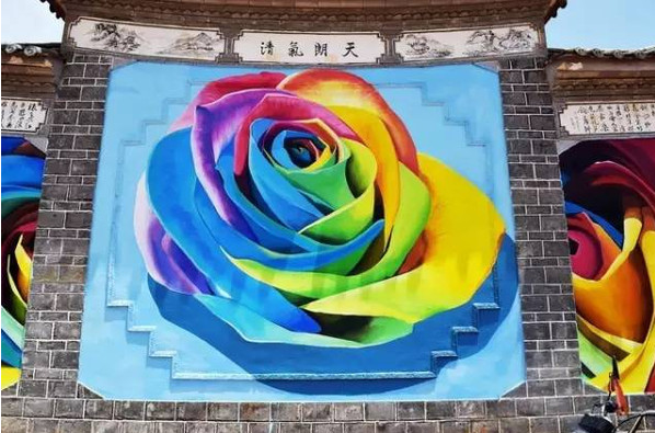 麗江市古城區(qū)七河鎮(zhèn)金龍村,藏著一座童話般的小鎮(zhèn)。這個小鎮(zhèn)里的房子刷成了九種顏色,房前屋后都種滿玫瑰花。房子的墻壁上,村里的道路上,繪滿了各種各樣美輪美奐的3D畫。這些3D畫大多取材于生活,不少壁畫把大山、電站大壩、人背馬馱的移民景象留在了墻上。因小鎮(zhèn)的房屋共刷成9個顏色,加上村里居住著白、納西、傈僳、漢等9個民族,于是這個村落便有了一個美麗夢幻的名字——“九色玫瑰小鎮(zhèn)”。