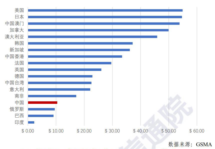 圖 世界主要國家移動通信用戶月均支出(單位:美元)