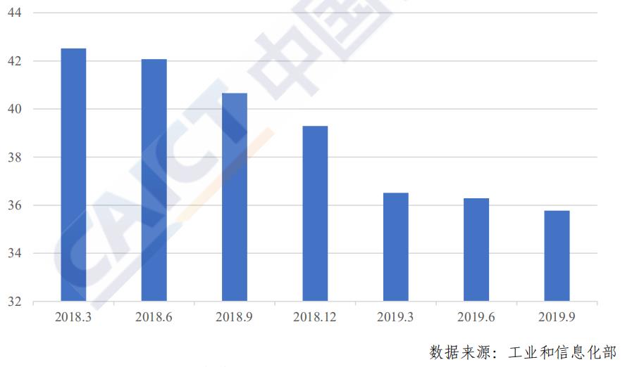 固定寬帶業(yè)務方面,我國固定寬帶月戶均支出穩(wěn)步下降。2019年第三季度,我國固定寬帶月戶均支出為35.8元,同比下降12%。