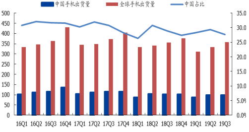 圖表 2-21:中國(guó)及全球手機(jī)出貨量,以及中國(guó)占比情況(百萬(wàn)部)