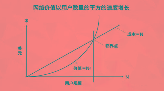 第二,規(guī)模對(duì)網(wǎng)絡(luò)價(jià)值的影響具有外部性。即規(guī)模越大,單個(gè)存量用戶獲得的效用越大。隨著新節(jié)點(diǎn)的接入,網(wǎng)絡(luò)價(jià)值非線性增長(zhǎng),對(duì)原來(lái)的節(jié)點(diǎn)而言,從網(wǎng)絡(luò)獲得的價(jià)值也會(huì)越大。一般的資產(chǎn),分享者愈多,個(gè)體所得愈少。