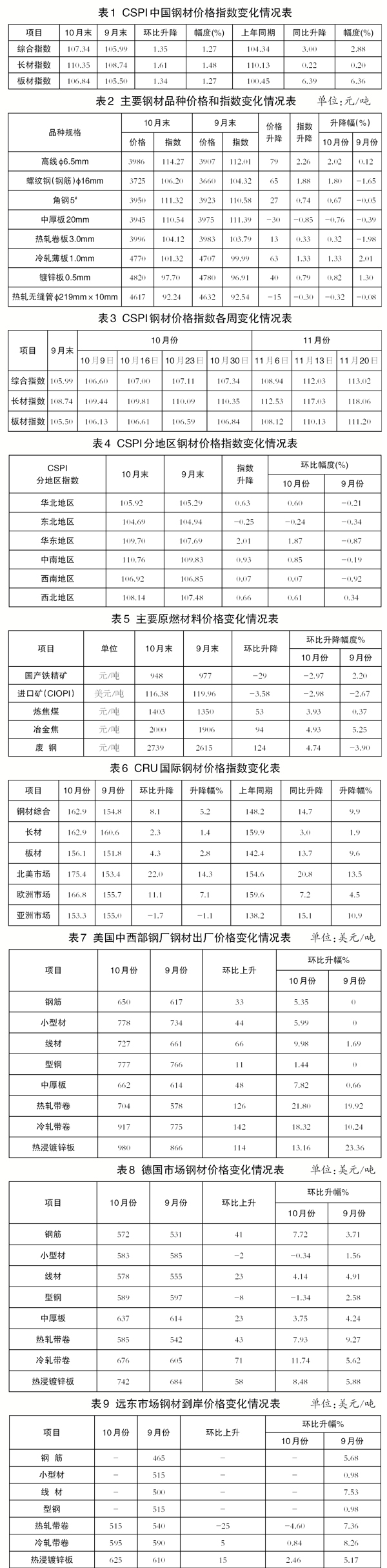 10月份,國(guó)際鋼材價(jià)格指數(shù)(CRU)為162.9點(diǎn),環(huán)比上升8.1點(diǎn),升幅為5.2%,較9月份縮小2.0個(gè)百分點(diǎn);同比上升14.7點(diǎn),升幅為9.9%。(見(jiàn)圖3、表6)