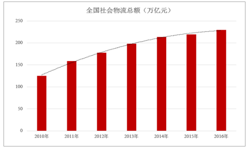 近年來,雖然我國(guó)社會(huì)物流總額的增速減緩,但由于經(jīng)濟(jì)仍保持穩(wěn)定增長(zhǎng)也拉動(dòng)著物流行業(yè)的剛性需求。 2016 年全國(guó)社會(huì)物流總額 229.7 萬億元,按可比價(jià)格計(jì)算,比上年增長(zhǎng) 6.1%,增幅比上年提高 0.3 個(gè)百分點(diǎn)。全年社會(huì)物流總額呈現(xiàn)穩(wěn)中趨緩,增速小幅回升的發(fā)展態(tài)勢(shì)。從構(gòu)成情況看, 2016 年工業(yè)品物流總額 214.0 萬億元,按可比價(jià)格計(jì)算,比上年增長(zhǎng) 6.0%,增速比上年回落 0.1 個(gè)百分點(diǎn);進(jìn)口貨物物流總額 10.5 萬億元,增長(zhǎng) 7.4%,提高 7.2 個(gè)百分點(diǎn);農(nóng)產(chǎn)品物流總額 3.6 萬億元,增長(zhǎng) 3.1%,回落 0.8 個(gè)百分點(diǎn);再生資源物流總額 0.9 萬億元,增長(zhǎng) 7.5%,回落 11.5 個(gè)百分點(diǎn);單位與居民物品物流總額 0.7 萬億元,增長(zhǎng) 42.8%,提高 7.3 個(gè)百分點(diǎn)。整體中國(guó)社會(huì)物流的總額雖然在增速上呈現(xiàn)減緩的趨勢(shì),但整體物流行業(yè)還是處于一個(gè)上升階段。