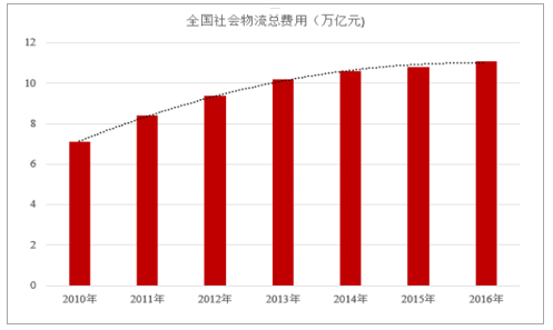 伴隨社會(huì)物流總額的增加,我國(guó)社會(huì)物流總費(fèi)用(包括運(yùn)輸費(fèi)用、保管費(fèi)用和管理費(fèi)用)也保持增長(zhǎng)趨勢(shì)。 2016 年社會(huì)物流總費(fèi)用 11.1 萬億元,比上年增長(zhǎng) 2.9%。 2010-2016 年,我國(guó)社會(huì)物流總費(fèi)用年復(fù)合增長(zhǎng)率達(dá) 7.73%3,反映我國(guó)物流行業(yè)在需求旺盛的情況下,費(fèi)用規(guī)模也不斷擴(kuò)大。