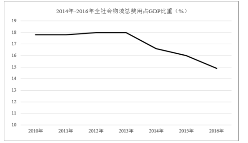 國(guó)際通行以全社會(huì)的物流總費(fèi)用占 GDP 的比例來衡量整個(gè)經(jīng)濟(jì)體的物流效率,社會(huì)物流總費(fèi)用占 GDP 的比例越低表示該經(jīng)濟(jì)體物流效率越高、物流發(fā)展水平越發(fā)達(dá)。近年來我國(guó)物流總費(fèi)用占 GDP 的比例總體呈緩慢下降的趨勢(shì),從2010 年 17.8%逐漸下降至 2016 年 14.9%5,表現(xiàn)出我國(guó)物流效率逐漸提高。 2015年 8 月 13 日,國(guó)家發(fā)改委發(fā)布《關(guān)于加快實(shí)施現(xiàn)代物流重大工程的通知》(以下簡(jiǎn)稱“通知”),通知指出到 2020 年,全社會(huì)物流總費(fèi)用與國(guó)內(nèi)生產(chǎn)總值的比率在目前 16.6%的基礎(chǔ)上再下降 1 個(gè)百分點(diǎn),物流業(yè)對(duì)國(guó)民經(jīng)濟(jì)的保障和支撐作用將進(jìn)一步增強(qiáng)。
