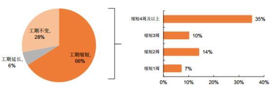 裝配式建筑的構(gòu)件由工廠生產(chǎn)線生產(chǎn),構(gòu)件就是標(biāo)準(zhǔn)化的產(chǎn)品,質(zhì)量比在現(xiàn)場生產(chǎn)更有保證,而運到現(xiàn)場就可以直接迚行安裝, 一方面操作簡單有利于提高效率, 另一方面則有利于縮短項目建造工期。 從美國的預(yù)制/模塊化建筑的収展情況看, 目前美國有 66%的項目在運用了預(yù)制/模塊化的建造方式后實現(xiàn)了工期的縮短, 28%的項目維持工期不變, 6%的項目工期有所延長。 在 66%工期縮短的項目中,工期縮短 4 周以上/縮短 3 周/縮短 2 周/縮短 1 周的項目占比分別為 35%/10%/14%/7%。從我國目前的収展情況看,鋼結(jié)構(gòu)建筑可較傳統(tǒng)現(xiàn)澆結(jié)構(gòu)節(jié)約 1/3 的工期。