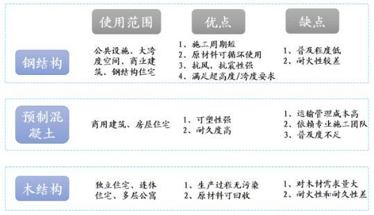 現(xiàn)階段裝配式建筑主要包括鋼結(jié)構(gòu)、混凝土結(jié)構(gòu)、現(xiàn)代木結(jié)構(gòu)三大結(jié)構(gòu)體系。三大結(jié)構(gòu)體系依使用范圍與自身特點,各有優(yōu)勢。