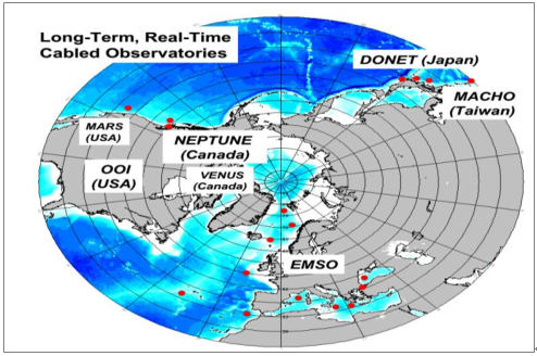 目前世界上已經(jīng)初步建成或在建的較大規(guī)模觀測網(wǎng)主要有:歐洲ESONET/EMSO、美國OOI、加拿大ONC(由VENUS與NEPTUNE組成)、日本DONET、及我國臺(tái)灣MACHO等。其中,前三個(gè)項(xiàng)目用于海洋探索及多學(xué)科研究,DONET及MACHO項(xiàng)目則主要用以地震監(jiān)測和海嘯預(yù)警。