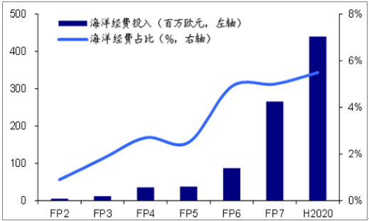 未來,只有占據(jù)信息優(yōu)勢的國家才能掌控海洋。當(dāng)前,各國為加強(qiáng)海洋信息化建設(shè),均在海洋探索研究領(lǐng)域出臺(tái)相關(guān)政策計(jì)劃并投入重金,以期在國際競爭中先發(fā)制人。以美國和歐洲(歐盟)為例,據(jù)美國國家科學(xué)基金會(huì)預(yù)算,未來5年保持每年3.5億美元投入海洋研究。在歐盟研究框架計(jì)劃中,海洋探索領(lǐng)域的投入占比不斷增加,在2014和2015年海洋領(lǐng)域投入總額已經(jīng)高達(dá)4.4億歐元。