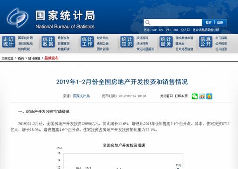 國家統(tǒng)計(jì)局3月14日公布的數(shù)據(jù)顯示,2019年1-2月份,全國房地產(chǎn)開發(fā)投資12090億元,同比增長11.6%,增速比2018年全年提高2.1個(gè)百分點(diǎn)。其中,住宅投資8711億元,增長18.0%,增速提高4.6個(gè)百分點(diǎn)。住宅投資占房地產(chǎn)開發(fā)投資的比重為72.1%。...