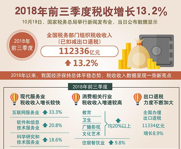 10月22日,國家稅務(wù)總局日前發(fā)布的數(shù)據(jù)顯示,今年前三季度,全國稅務(wù)部門組織稅收收入(已扣減出口退稅)112336億元,增長13.2%,其中,第三季度增長8%,比二季度增速回落5.1個百分點(diǎn),體現(xiàn)出我國一系列減稅降負(fù)措施成效不斷顯現(xiàn)。...
