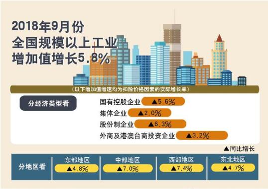 2018年9月份,規(guī)模以上工業(yè)增加值同比實(shí)際增長(zhǎng)5.8%(以下增加值增速均為扣除價(jià)格因素的實(shí)際增長(zhǎng)率),比8月份回落0.3個(gè)百分點(diǎn)。從環(huán)比看,9月份,規(guī)模以上工業(yè)增加值比上月增長(zhǎng)0.50%。1-9月份,規(guī)模以上工業(yè)增加值同比增長(zhǎng)6.4%,增速較1-8份回落0.1個(gè)...