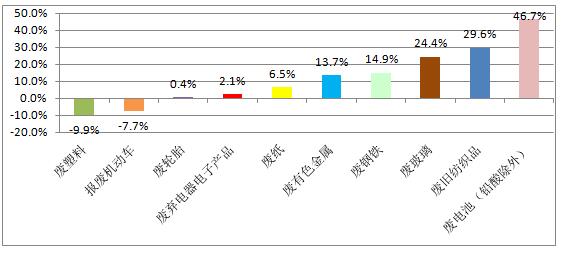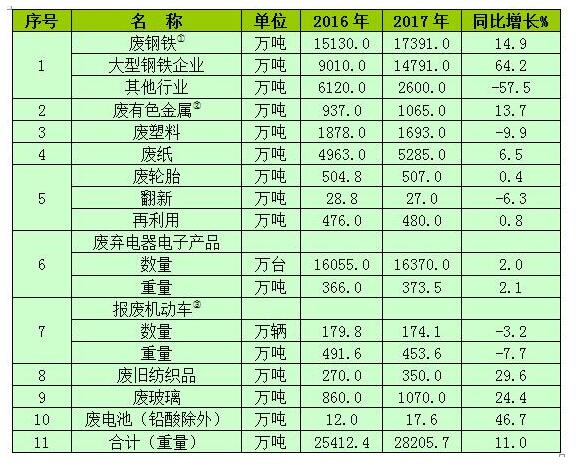 2017年,我國十大品種再生資源回收總值為7550.7億元,受主要品種價(jià)格上漲影響,同比增長28.7%,所有再生資源品種回收總值均有增長。其中,廢舊紡織品增幅最高,同比增長62.8%;廢輪胎增幅相對最小,同比增長4.3%?! ∮捎阡撹F、有色金屬等大宗商品...