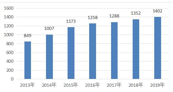 中金普華發(fā)布的《2019-2025年中國塑料粒子(顆粒)行業(yè)專項(xiàng)調(diào)研分析及投資戰(zhàn)略預(yù)測(cè)報(bào)告》指出:近幾年,我國再生塑料顆粒行業(yè)產(chǎn)量快速增長,從2013年的849萬噸增長到2019年的1402萬噸,近幾年我國再生塑料顆粒行業(yè)產(chǎn)量情況如下圖所示: