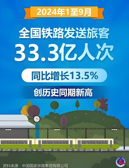 從中國國家鐵路集團(tuán)有限公司獲悉,今年1至9月,全國鐵路發(fā)送旅客33.3億人次,同比增長13.5%,再創(chuàng)歷史同期新高,全國鐵路運輸安全平穩(wěn)有序。...
