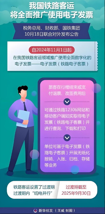 稅務(wù)總局、財政部、國鐵集團(tuán)18日聯(lián)合對外發(fā)布公告,自2024年11月1日起,在我國鐵路客運領(lǐng)域推廣使用全面數(shù)字化的電子發(fā)票——電子發(fā)票(鐵路電子客票)。旅客不再需要打印鐵路車票(紙質(zhì)報銷憑證),出行和報銷更便利。...