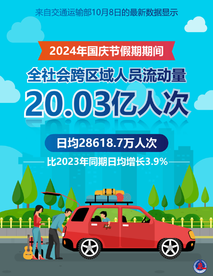 來自交通運輸部8日的最新數(shù)據(jù)顯示,2024年國慶節(jié)假期期間,全社會跨區(qū)域人員流動量20.03億人次,日均28618.7萬人次,比2023年同期日均增長3.9%。...