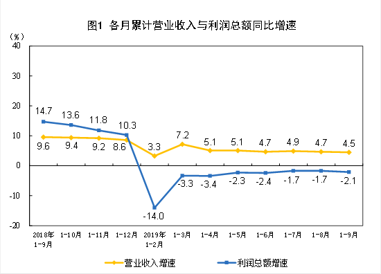 1—9月份,全國(guó)規(guī)模以上工業(yè)企業(yè)實(shí)現(xiàn)利潤(rùn)總額45933.5億元,同比下降2.1%(按可比口徑計(jì)算,考慮統(tǒng)計(jì)制度規(guī)定的口徑調(diào)整、統(tǒng)計(jì)執(zhí)法增強(qiáng)、剔除重復(fù)數(shù)據(jù)、企業(yè)改革剝離、四經(jīng)普單位清查等因素影響,詳見附注四),降幅比1—8月份擴(kuò)大0.4個(gè)百分點(diǎn)。...